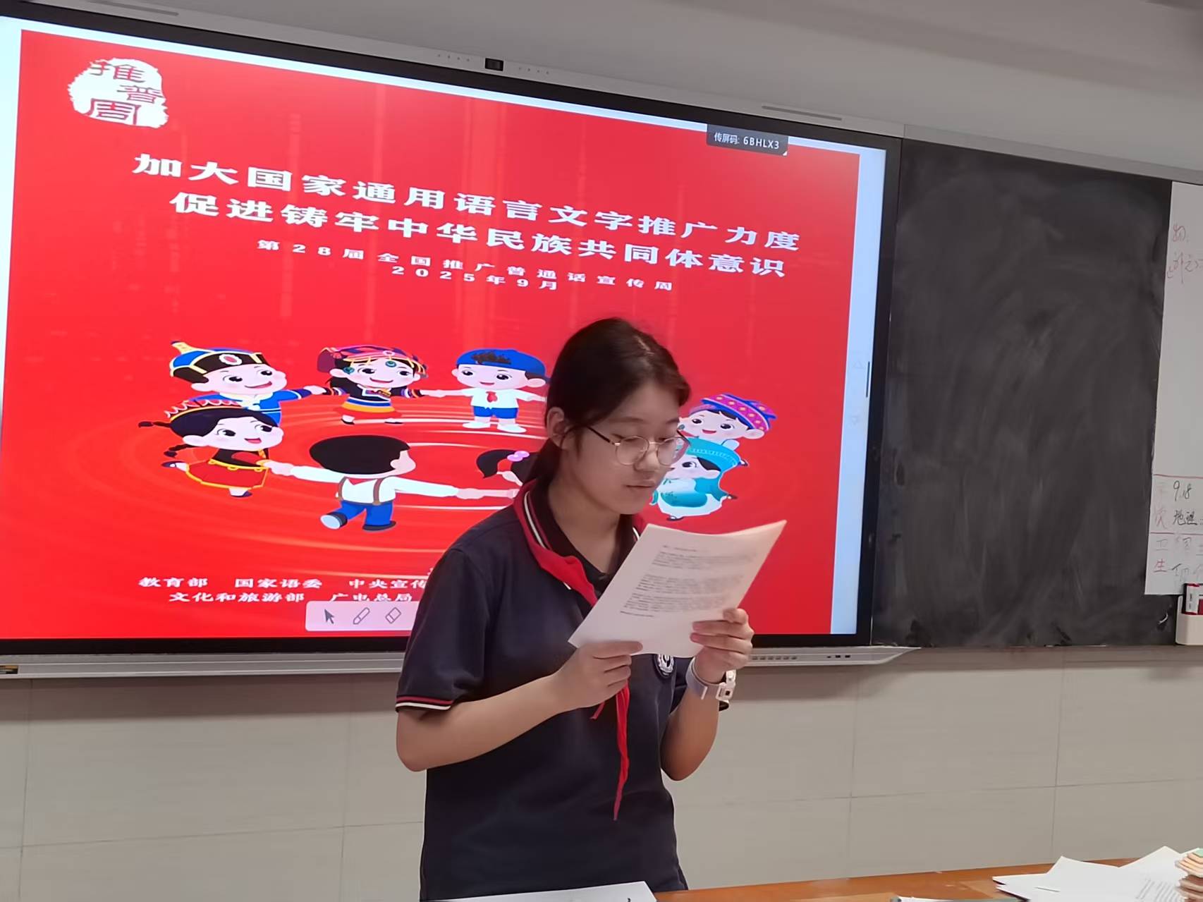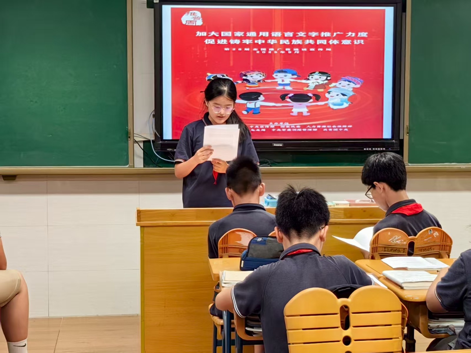 活动在庄严的国旗下讲话中拉开帷幕。七年级语文备课组长陈霞老师发表讲话,强调普通话作为国家通用语言的重要性,鼓励同学们积极学习、规范使用普通话,传承中华优秀语言文化。