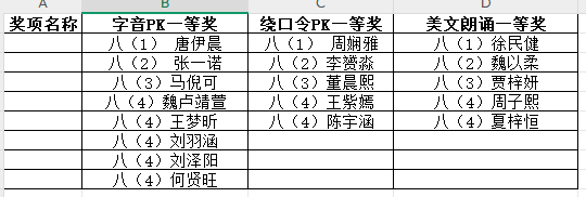 八年级以班级为单位,开展了“字音大王”“绕口令大比拼”和“散文朗诵”三项竞赛。同学们踊跃参与,现场气氛热烈。最终每班评选出三位优胜者,分别荣获“字音大王奖”“巧舌如簧奖”和“天籁之音奖”。