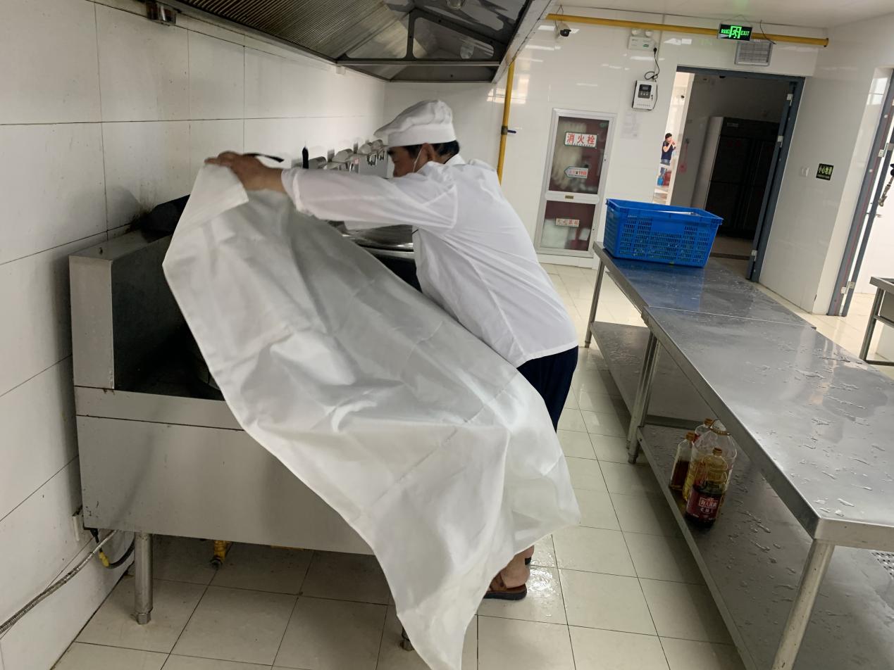 随着警报响起,食堂全体员工立即启动火灾应急处置程序,领导小组和食堂管理人员迅速到位并进行指挥,断电、断气、救火,各项工作同时进行,有条不紊,随后所有人员自觉排队,用湿毛巾堵住口鼻弯腰前行,有序撤出食堂。